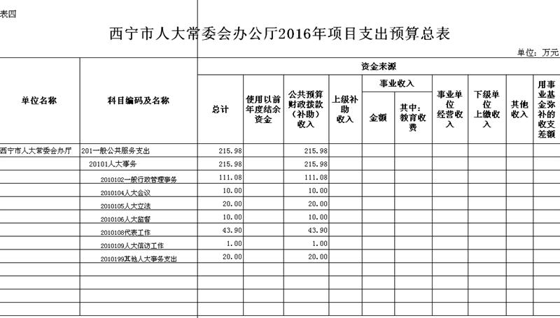 本表按功能分类科目和资金来源编制,反映人大2016年度部门预算中为完成特定的行政工作任务,用于专项业务工作的经费支出预算安排情况。